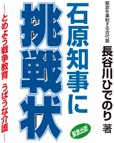 05年7月3日、準国政選挙と言われている東京都都議会議員選挙の投票日が行われる。東京都は石原都知事の支配下にある、といっても言い過ぎではないだろう。そんな東京都で、石原都知事に挑戦状を叩きつけた一人の男性がいる。都政を革新する会代表の長谷川ひでのり氏だ。彼が、今回都議選に立候補するにあたって一冊の本を発行した。それがこの本、「石原都知事に挑戦状〜とめよう戦争教育 うばうな介護〜」だ。