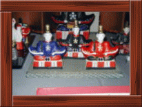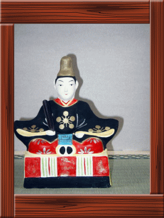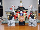 富山土人形の天神様は、天神様以外に 随身や、灯篭、狛犬、狐、神主、太鼓など の付属品が、たくさんついて、セットになっています。