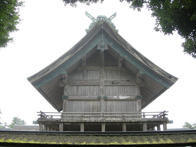 皆生温泉から高速を使って約2時間。平成の遷宮を前に8/17まで内宮の特別内覧をしていたようで、真新しいスギ辺材の板塀とシナ合板のスロープがその雰囲気を残していた。写真は、本殿(内宮)を真裏から撮影したもので、大屋根を受けるすぐ下の桁は、繊維の傾いた走行と節付近の感じからマツ材と思われる。伊勢神宮とは、2礼4拍1礼(伊勢式は2礼2拍1礼)、使われている材(白木はヒノキではなくスギ辺材)、大屋根棟木をまたぐ葺き材を押さえている交差材(ただし銅板でクラッド)の切り口(切り口が上向きではなく横向き)、式年遷宮は20年ではなさそうなど、いろいろな点で異なることを知った。いわれているように侵略してきた弥生人(伊勢派)が、縄文人のたたりを封じた大社のようだ。参拝者の数は伊勢の1/10程度かな。ここで見たものは、巨大なしめ縄と房に投げ入れた硬貨、空にたなびく日本国旗、さざれ石(岐阜県産)、植樹されたコウヤマキ、神前結婚式、ケヤキ彫りの因幡の白ウサギ、ムクノキの実。午前11時、大社を離れ帰路につく。帰りも雨に遭う、目的地では全て、なんとか遭わずにすんだ。