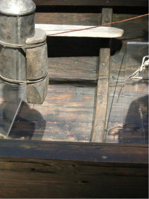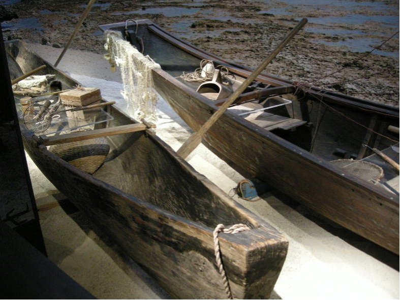 写真2.リュウキュウアカマツのくり舟(左)とスギの合わせ舟(右) 分銅形接合材(中央)にイヌマキを使用と聞く |