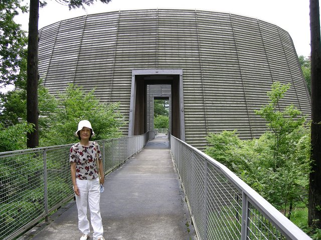 朝5時に出発、福知山ICから鳥取まで9号線をひた走る。途中「木の殿堂」の看板を確認して脇道にそれ、昼食がてらに兵庫の屋根「氷ノ山・鉢伏山」のほうに8qばかり山道を車でのぼる。道の脇には「クマ出没中」という看板もあり、この道山道を知る人ぞ来るといった感じ。水と森と木づくり(林内に設けられた直線で高床の立派な廊下からパノラマ的に見学できる:写真)から日曜工作(一般開放の工作室がある)、住宅造りまでを一貫して実感体験できる施設である。ただし、住宅作りは、「世界の家」と「世界の大工道具」展示のみで、庭造りのみが1qほど奥にある瀞川平植物園の入り口にもなっているビジターハウスで教えてもらえそう。