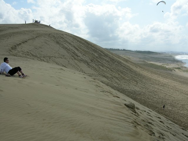 9号線にもどり鳥取市に入って、砂丘道路方面に右折、そこからたぶん5、6q、海沿いの直線的な道を走って緩い左カーブでやや上り坂を登り切った付近右手に大きな駐車場があった。道や駐車場からは、砂丘の全容は見えない。車を降りて右手の木製の階段を2、30段上ったところで、しばしの間別世界。実際に行き帰り歩いてみると、途方に暮れるほどスケールは大きくはなく、歩くのにてごろといったところか。雨上がりで、表層の砂は乾いていた。ここで見たものは、馬がひく乗合車、人を載せた駱駝、パラグライダーに乗って8の字を空に描く人、素足で歩く人々、海を見ながら腰を下ろす人、橇で砂丘を下る子供、波打ちぎわで一発大波に遭ってズボンを濡らした人、私は走って逃げ切ったけど。