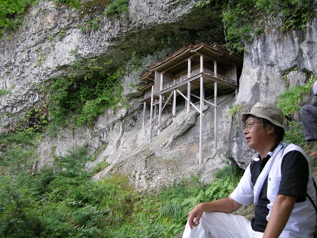 鳥取駅前の宿から、9号線をそれて西南西方向にまっすぐ約1時間半で、山道の峠を越え裏側からアクセスした。奥の駐車場の手前に遙拝所があった。標高470mの高さにある投入堂が、うんと見上げる岩棚の下にちょこんとまさに投げ入れられた感じに見えた。靴裏の滑り止めパターンを2度も確認され登山経験を聞かれ、タスキと小さなクマ鈴をつけて、木戸をくぐって、道のり700m、標高差300m、道はうんと険しくて命の危険を感じる寸前でおもしろかった。大岩の上と岩棚の下にいくつかのお堂と鐘楼があり、空、土、岩、森に向かって祈りを捧げる道であった。ここで見たものは、イヌシデ、ヒノキアスナロ、スギ、ブナの大木と、ヤマグルマの花盛り、ナナカマドとシャクナゲの実、蜂の巣、クリの基礎束組、戸板の又釘からの鉄汚染、岩棚からしたたり落ちる水しぶき、発掘中の作業、おいしいドクダミ茶、気さくに話してくれる住職でした。入山時刻と下山時刻を分単位で記入させられた。密教系だが何となくそれぞれに我が道を行くインド的かつ庶民的な感じがした。観光地としても、宗教組織としても、建築としても、ひと味違うかな。