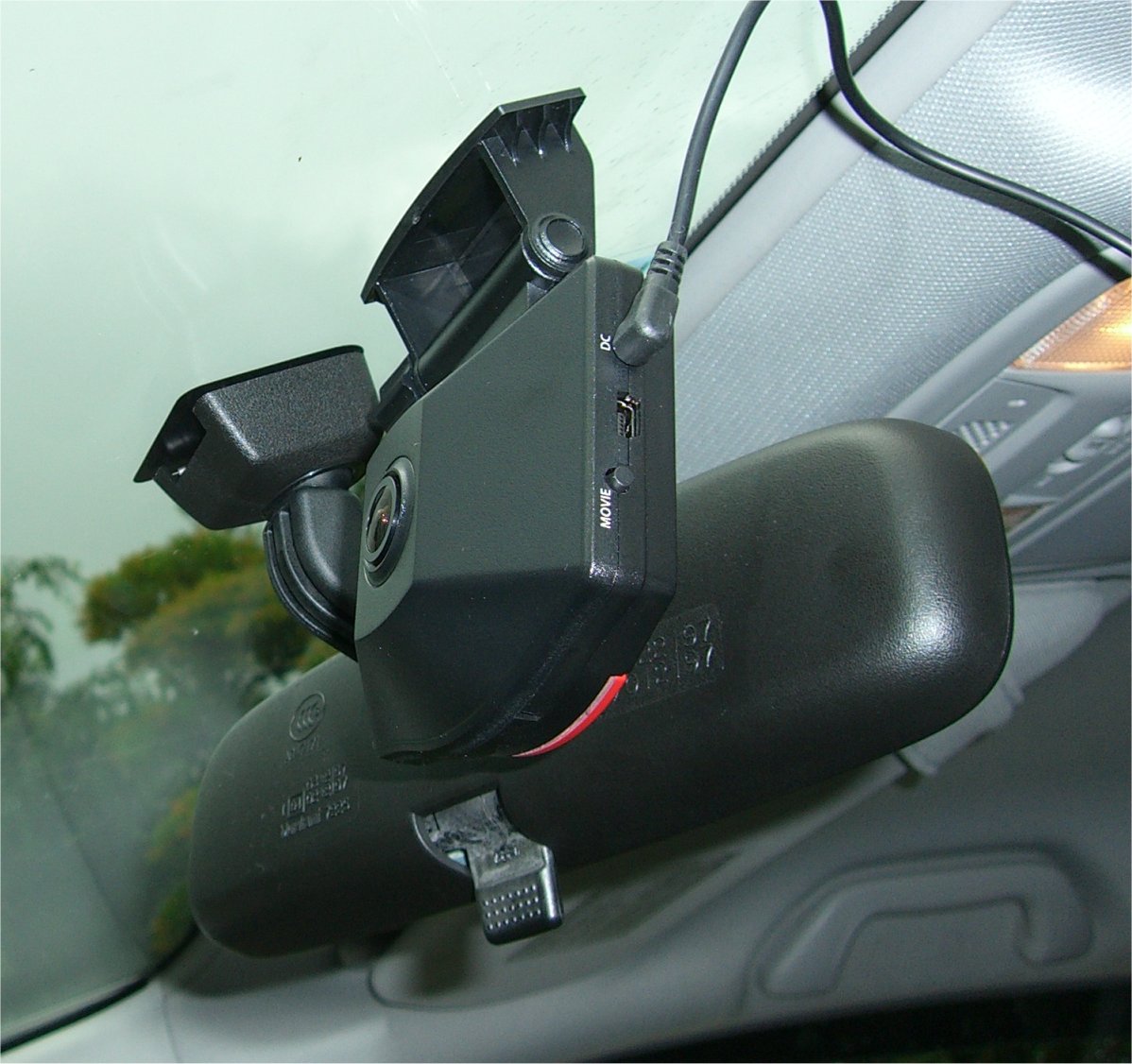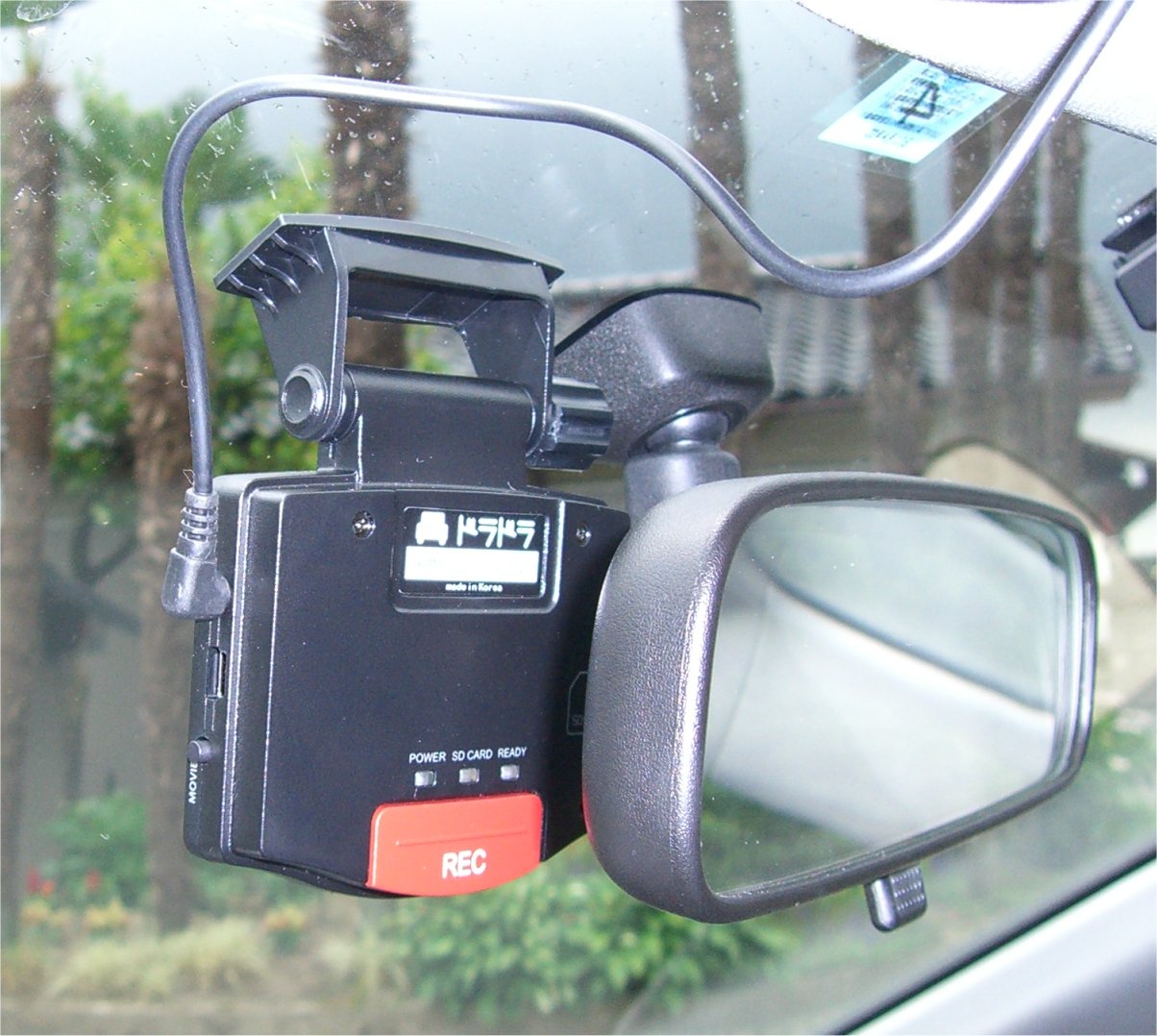 入手が遅くなるのではと思っていたが、何とこのレポートを書いている日の夕方に、商品が届いた(注文から3日)。早速バックミラーの後ろのフロントガラスに両面テープで固定し、電源ケーブルをシガレット電源を入れると、本体のLEDが点滅し(約20秒)、その後常時点灯になった。「手動記録ボタン」を押してみると、しばらくRECランプが点滅し、データが記録されているようである(前後15秒)。本体の横にある「常時記録ボタン」を押すと、RECランプの点滅が止まらなくなり、常時記録されているようである。