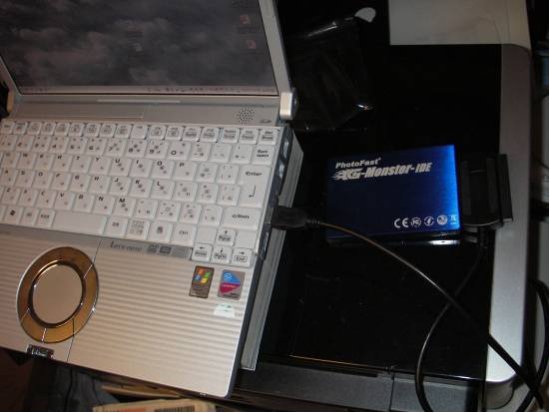 まず、HDDの中身をコピーします。IDE-USB変換ケーブルで接続し、コピーソフトはACRONISのTrueImageを使用しました。