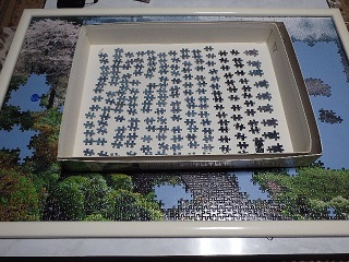 我が家の正月行事と言えば、ジグソーパズルである。日頃、時間が無くゆっくりと出来ないので、徹夜も可能な正月が、パズルが出来るよい機会です。2人がかりですが、1000ピースのパズルであれば3〜5日、2000ピースであれば1〜2週間でほぼ出来上がります。大きさが畳サイズの4000ピースのナポレオンの戴冠式も作りましたが、6000ピースのノイシュバンシュタイン城はパネル(畳サイズ1.5枚分)を広げるスペースが無く、現在はお蔵入りです。なお、最近は風景が多く、パネルサイズは75×50cmで統一しています。我が家のジグソーパズル攻略法は、