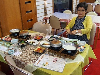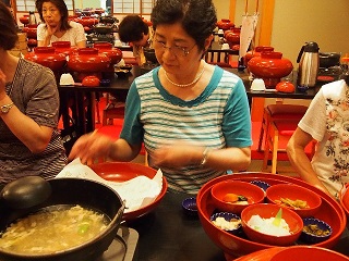 大東館は草津の中心である湯畑の前にある旅館で、明るいうちに写真を撮りながら湯畑を一周する。暫く撮影後、宿に戻り、夕食会場に向かう。会場には一番乗りで好きな席に座ることが出来た。その後ツア−の仲間などがやってきて、ほぼ半分くらいの席を占めた。