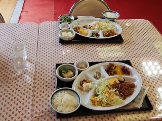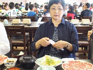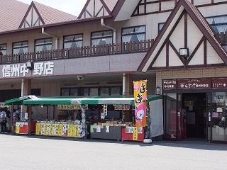 バスは山を下りて開けた所(湯田中)に出た。さらに、整備された道路を進むと、昼食会場であるビアンテ信州中野店についた。ビアンテは団体専門の店で馬刺しが有名と聞いていたが、昼食に出てきたのは幻豚のようでした。団体専門ということで食堂や土産ショップは修学旅行の中学生でいっぱいだった(バス5台の学校もあり、先生たちも大変)。
