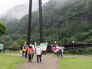 バスに乗り最初の見学は「鬼怒楯岩大吊橋」で、宿からも近く、5分で駐車場に付いた。雨はパラパラで、傘が無くても良さそうだが、安全のために傘を持ってバスから降りる。