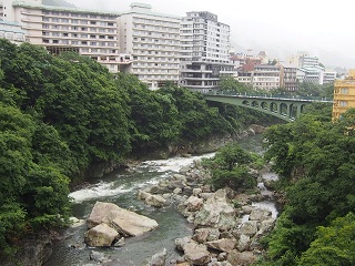 前日は早く寝付いたので、朝は5時前に目を覚まし、早朝の風呂を浴びる。露天風呂や宿の窓からは鬼怒川の岩がごつごつした川の景観が見下ろせる。しかし、真下を見ると、川の中に砂が多く溜まっており、重機もいる。聞くところによると、昨年の豪雨で、隣の宿が流され、その爪痕らしい。窓から身を乗り出してみると、30度ほど傾いた隣の建物が見えた。