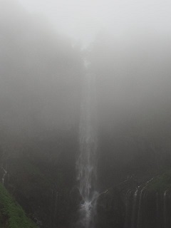 滝を上から見ることが出来る展望台に行ってみるが、音はするがガスで滝はほとんど見えない。折角なので滝の下までエレベータで下ることにした。エレベータは100mほど岩の中を下り、地下トンネルの中を歩いていくと、華厳の滝が見えてきた。上空は相変わらずガスがかかっていたが、下から見上げると何とか滝の全体を見ることが出来た。