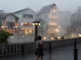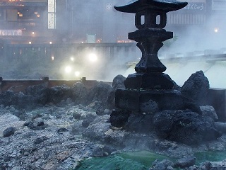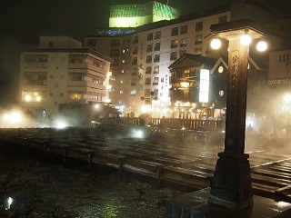 | 雨に濡れる湯畑 | 湯滝の灯籠 | 夜の湯畑(奥には大東館) |