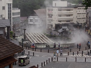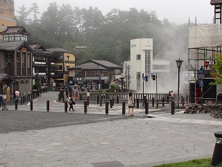 草津温泉は霧の中。ツアーの客は草津では大東館、草津温泉ホテルリゾート、草津ナウリゾートと3つの宿に分かれて泊まる。草津温泉ホテルリゾートが標準パックで、大東館と草津ナウリゾートはオプションである。今回は、温泉街の中心にある大東館を選択していた。