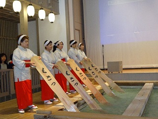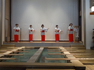 演舞が先と思っていたら、湯もみからすぐ始まった。演技者による湯もみが終わると、湯もみの一般参加者の募集が2回あり、10人ずつで湯もみ体験ができる。女房にも出るようにと勧めたが護持され、子供たちやツアー参加者の何人かが参加していた。
