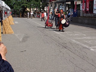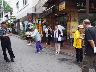 演技が終わりバスの集合時間までに少し時間があったので、「西の河原通り」を散策する。店の前で饅頭を配っている「松村まんじゅう」があり、お茶ももらって一寸立ち寄る。事前に調べてあった「草津煎餅本舗」で草津煎餅を買って、松村まんじゅうで栗あん入りの温泉饅頭を買った。また、帰る途中の小物屋の「てとて」で夏向きの飾りハンカチを見つけ、飾り棒付きで購入した。