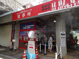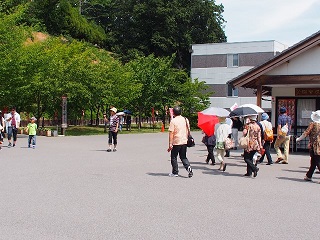 この日は前日までの天気と異なり、晴天で夏の日差しである。屋根のある無料休憩所でソフトクリームを食べながら休憩。その後、ゆっくりと場内を散策し、バスまで戻る。
