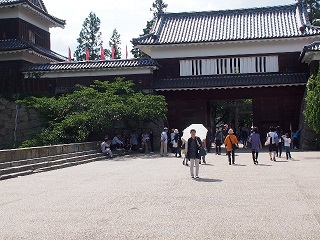 上田には少し手前の坂城ICで高速を下り、国道18号で上田城に向かう。上田城前にあるバス専用駐車場にバスは止まり、上田城の正門まで、城をぐるりと回るように歩く。この日は土曜日と言うことで、一般駐車場も混んでいて、見物客も多く出ている。