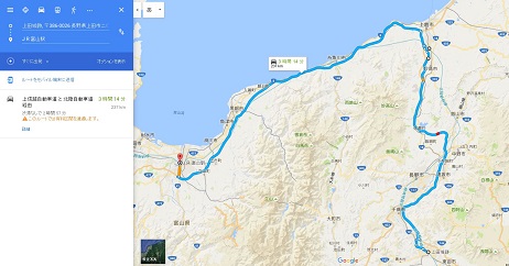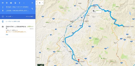 草津から上田に直接向かう道路(約55km、1:49)もあるが、信州中野を経由すると約108km(2:41)と倍の距離を走ることになる。ただ、そのうち半分以上が高速道路なので時間的には1時間弱の差となる。