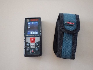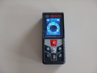 レーザ距離計は前々から興味があったが、屋外で等間隔で目印を付けたく、安価なレーザ距離計も販売されているが、「角度」(ピタゴラス測定が可能となる)が測定できるボッシュのGLM50Cを選択した。GLM50Cの主な測定モードは、@距離、A面、B容積・体積、C加算・減算、Dシングルピタゴラス、Eダブルピタゴラス、F間接ピタゴラス、G壁面積、H最小・最大、I連続、I傾斜、Kタイマー、L等間隔。測定距離は0.15〜50m(最小測定単位:0.1mm、測定精度:1.5mm)。 また、BlueToothでスマホやパソコンにデータを送ったり(スマキョリ)、リモートでコントロールできる。同じく通信機能付きGLM100Cの測定距離は100m。