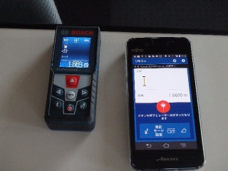 GLM50CのBlueTooth機能をONにし、スマホのBlueToothを接続し、Playストアから入手した無料アプリの「GLM測定&記録」(GLM100C用とあるが50Cでも動作)を起動すると、スマホでリモート測定やデータの保存ができた。なお、本体では1mm単位表示だが、スマホでは0.1mm単位で表示される