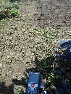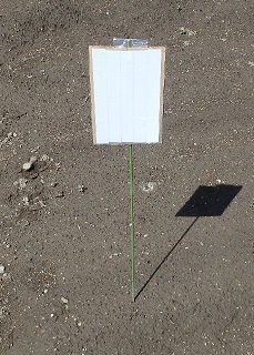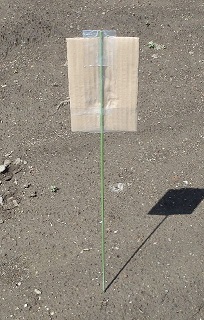 屋内ではレーザー照射点が確認できるが、明るい屋外では見づらい(日差しが直接あたっている場所でも測定できることがあるが)。そこで、園芸用の細ポールに段ボールを固定し、その表面に反射テープを貼った照射ターゲットを自作した。