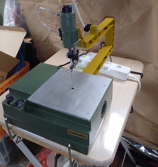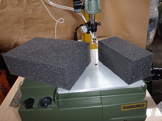 保護ケース用にスポンジを真っ直ぐに切り抜きたく、プロクソン(proxxon)の糸鋸盤であるコッピングソーテーブルEX(No.27088)を入手した。今まで、木材の切り抜きなどには、マキタのジグソーを作業テーブルに逆さまに固定して加工していたが、セットに時間がかかり、音も大きく、埃がたつなど、使う機会が少なかった。