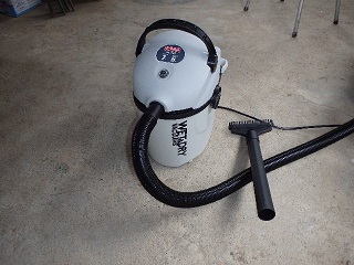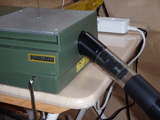 コッピングソーテーブルには切りくずを吸引するために吸塵機のノズルを差し込む穴が空いている。一般に、吸塵機は消費電力が大きく(1kw以上が多い)、家庭内では電流容量に余裕が無いので、なるべく消費電力が小さいものをと探していたところ、藤原産業 489225 E-Value 乾湿両用掃除機10L EVC-100P(500W程度) をDIYで見つけ入手した。