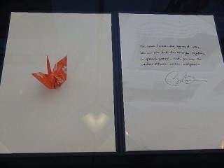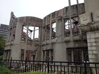 広島といえば必ず寄るべき所は、原爆記念公園で、特にこの期間はオバマ大統領が折った折り鶴があると言うことで寄ることにした。記念館の中は修学旅行シーズンでラッシュ時の電車の中の状態でなかなか進めなかったが、資料館の出口近くにさりげなく展示されていた。事前に知らなかったら通り過ぎてしまうところだった。宿泊が公園の近くだったので朝食前に原爆ドームまで散歩した。爆風で曲がった柱を見ると原爆の凄さを再認識した。ドームは真上からの衝撃だったので、その構造が残ったとのこと。