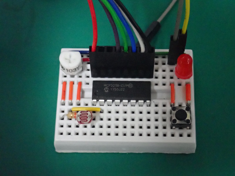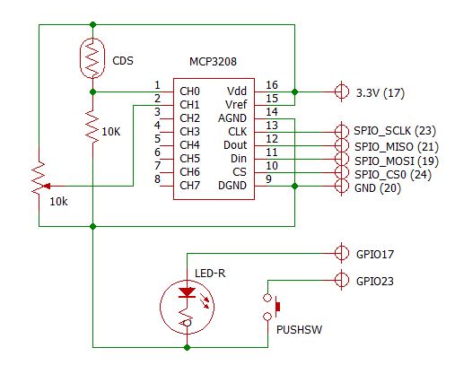 ラズペリーパイにはアルディーノと異なり、アナログ信号の電圧値を測定する端子が無い。そこで、よく使われるのがA/D変換ICが使われる。AD変換器としてSPI接続のMCP3208を用い、光が当たると抵抗値が変化するPDS光センサのアナログ電圧出力値をラズパイに取り込みを行った。