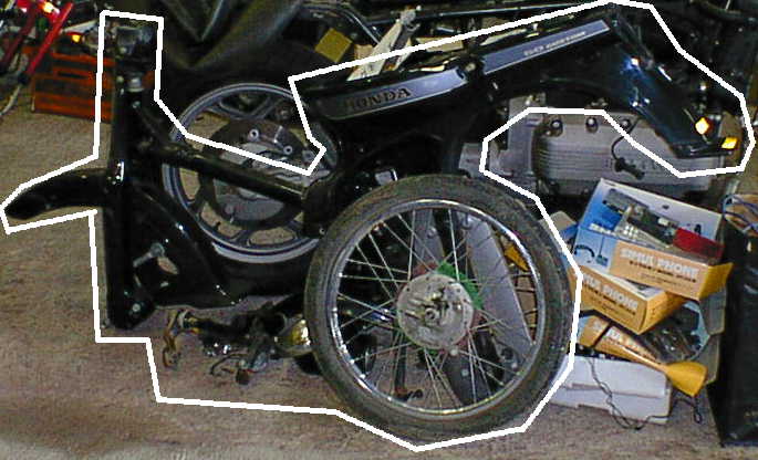 問題のフレームと 5千円つかみ取り(爆)の画像です。(白枠内) カクカクのリア廻りはカッコ悪いので世にも珍しい フェンダーレスのカブにでもしようかな?(爆)