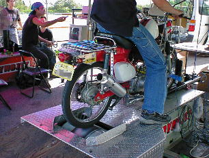 その頃に、0−50mタイムトライアルが行われており、一般のマシンで速いものは4秒丁度ぐらいである!! ショップが仕上げたマシンでは、キタコやGクラフト等が3秒中盤に入る熱い走りを見せてくれた! ちなみに50メートル地点の速度は70キロ以上である!!(50メートルで70キロに達するのは驚異である!!