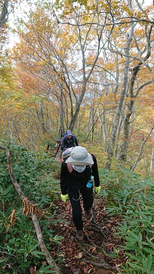 「二ノ字」からは、少し色付いたブナ林の中 緩斜面の尾根歩きとなった。