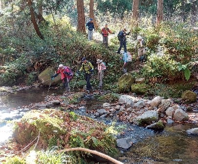 大日山山頂の広場で昼食、下山 急坂くだり 渡渉を繰り返し登山口に着きました。