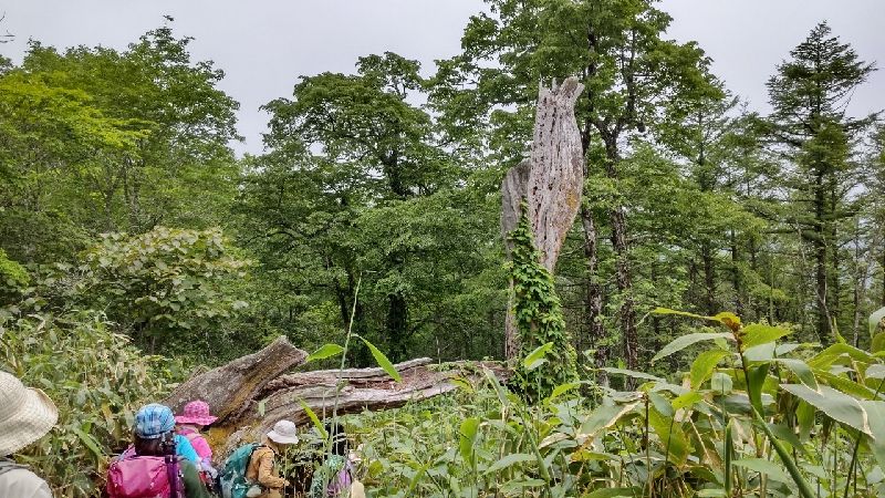東側から登る乾燥した登山道からは唐松が多いのに対し、下山路西斜面には多くの小沢の湿気が