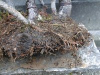 | 根切り前の状態 鉢より抜いたところ 2年間植え替えをしていないので 長い根は鉢の周りを1周していました |