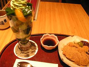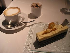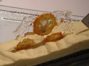 一番下はサクサクのパイ生地でチョコのムースにしっとりしたチョコのブラウニーっぽいもの。オレンジピールが入ってたかもしれません。それからオレンジ風味のムースがあり、金柑の飴細工が乗ってるみたいな感じですがすごい合ってて、や〜おいしかったです〜♪