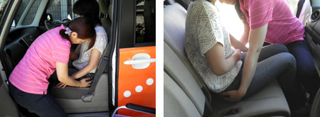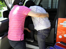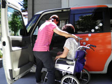 | 介助者は被介助者の麻痺足(左足)を車内に入れます この状態では座位が安定しないので、お尻の位置が座席の中央にくるように介助します |