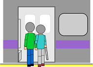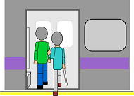 | 電車の利用 自動販売機は視覚障害者にとってはあつかいにくいものです。そのため、切符は誘導者が2人分をまとめて購入してもよいでしょう。鉄道会社の多くは身体障害者用の割引を実施していますので、係員に相談して利用してください。 駅の改札口の通過は狭いところの誘導と同じように一列になり通過します。切符は誘導者が2人分を渡します。自動式の改札口は2人分の切符を重ならないように一枚ずついれて、一列になって通過、順番に出てくる切符を2枚とるようにします。自分で切符を処理したいと希望する場合は切符を入れる場所や係員のいる場所を指示してあげてください。 電車の乗降の際は、ホームと電車の間にすき間がありますので、この点に充分注意しなければなりません。ドアの正面に立ち、ホームに対してまっすぐに近づき、ホームの縁にできるだけ近づいて並ぶようにして、ちょっと立ち止まります。「乗ります」と声をかけて誘導者が先に乗り込んで視覚障害者が続きます。誘導の基本姿勢のまま乗り込むと、半歩後ろにいる視覚障害者は電車とホームの間に足を落としやすくなるので気をつけてください。 また、不安なときは、視覚障害者の手を入り口の手すりに誘導して、それからホームの縁を確認してもらって乗り込んでください。降りるときも同じ要領で降り口を確かめてから降りてください。その他、電車の乗降は、このホームと電車の間のすき間を溝と考えれば、溝をまたぐ時と基本的には同様の方法で行うことができます。必要に応じてその視覚障害者と話し合いながら判断して下さい。 座席に誘導する場合は、視覚障害者のひざを座席に触れさせて、座るように声をかけてください。 混雑しているホーム等の歩行では、危険なことなどのないよう特に注意が必要です。また、急がず、人の流れが途切れるまで待ってから、歩き出すようにしてもよいでしょう。 |