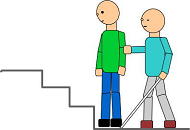 | 階段は段に対して直角に近づき、「昇り(降り)の階段です」とひと声かけてから、誘導者はまず一段昇って、又は片足だけ昇っていったん止まります。視覚障害者が足先などで階段を確認したら視覚障害者の歩調にあわせて一段先を昇ります。昇降中は危険ですので斜めに進んだり、用もないのに途中で立ち止まったり、振り返ったりせず、リズム良く昇降します。最後の段には、視覚障害者が上る余地を考えて少々前に位置するようにして上り、そして、止まって視覚障害者を待ちます。その際、誘導者の足は動かさないようにします。少しでも動くと、視覚障害者にはまだ階段が続くように感じてしまいます。最後の段に視覚障害者が上った時に「階段はおわりです」というように一声かけるようにします。又は踊り場あるいは最終段に着いたとき、誘導者は「あと一段で終わりです」等と階段が終わりになることを知らせます。階段に手すりがあれば希望を尋ねて手すりを使用してください。らせん階段では視覚障害者が幅の広い外側を歩いたほうが安全です。 溝に直角に立ち、誘導者は視覚障害者が足を置く余地を考えて、少々前に位置するようにしてまたぎます。そして、立ち止まり、視覚障害者がまたぐのを待ちます。その際、誘導者の足は動かさないようにします。この誘導者が先に渡るということにより、視覚障害者の誘導されている腕が伸びてどのくらいの幅の溝かが視覚障害者に理解してもらえる場合があります。白杖を使う方法もあります。覚障害者がまたいだあと足を置けばよい位置を視覚障害者の持っている白杖で示します。そして、2人同時にまたぎます。ただ、白杖で示す時は、視覚障害者にその白杖に触れることを前もってことわって下さい。溝をまたぐ方法はいくつかありますので、その場に応じて適切に判断して下さい。 視覚障害者はホームや階段から落ちないためには、線路や階段にまっすぐにむかっている必要があります。そのために絶えず歩いている方向(角度)を意識していたいのです。慣れたところでは、頭の中に「メンタル・マップ」という地図が描けています。点字ブロックをはずれて近道をされては困ることがあります。点字ブロックの上を歩くようにしてください。 |