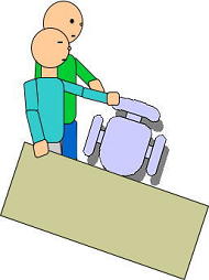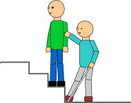 | 誘導者は握られた腕は自然に下におろし、歩く時は前後に振ったり、脇から離したりしないようにしてください。身長差や視覚障害者の好みに応じて肩やひじの下を持たせてもかまいません。後ろから押したり、白杖を持ったり手や衣服を引っ張ったりしないでください。視覚障害者は誘導者の後方から歩いていくのが安心なのです。 歩く早さは、相手に合わせるようにしてください。誘導する時の視覚障害者の肘の握り方でその不安度が分かります。強く握られたり、後ろに引っ張られるように感じるときは、歩行に不安を持っていたり、早すぎると思われますので速度をゆるめてください。 |