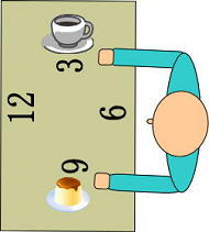 | テーブルの上の物の位置は、時計の文字盤を例にとって説明します。例えば「3時の位置にコーヒーがあります」「9時の位置はプリンです」と言った具合です。方向もこの要領で「2時の方向に駅があります」と言う説明をすることもできます。飲食する時は同じ要領で食器、お皿の中の食べ物の位置を時計の文字盤を例にとり説明し、必要であれば、そっと食器に触れさせてあげてください。特に熱いスープ類などの場合は注意が必要です。 |