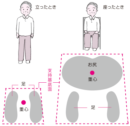 | 人間の動作は“重心の移動”が関係している 人が安定した姿勢を保っている場合、重心は頭の頂点から真下に向かっています。このとき、重心は必ず支持基底面(身体といす、ベッドが接している部分と接地している足を枠線で囲んだ面)の中に位置することになります。 この状態から別の姿勢に移る(座った状態から立った状態に移る、など)には、新たにつくられた支持基底面の中に重心をおさめることが必要です。その際には、重心を上下に移動させるだけでなく、前後左右にも移動させなければなりません。この上下と前後左右の移動を効率よく行うことが求められるわけです。 実際に、介助者自身が、座った姿勢から立ちあがってみてください。すると、無意識におじぎをしながら、前へ重心を移動しようとするはずです。重心を変えずに真上へ立ちあがることはできません。要介護者の動作もまったく同じ仕組みで成り立っていることを、まず理解しましょう。 |