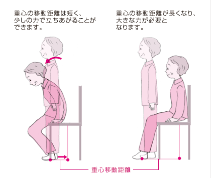 | “重心移動”しやすい姿勢をつくることが、自立への第一歩 もう一度、立ちあがる動作を試してみましょう。立ちあがる際には、“おじぎをする”だけでなく、①両足をいすの下に引く、②足の裏の前のほうへ重心をかける、はずです。 なぜ、足を引いて、おじぎをしようとするのでしょうか。座っているときは、お尻に重心がありますが、立ちあがったとき、重心は足の裏にかかります。立ちあがるためには、お尻から足へ“重心を移動”させなければなりません。足を前のほうにおいたまま重心を移動させようとすれば、長い距離を移動しなければならず、大変な力を必要とすることになります。 もし、重心移動の距離を短くしようと思えば、“座った状態で重心がかかっている場所(お尻)”の近くまで足を引きつけておけばいいわけです。これなら重心を移動させる距離が短くなるので、楽に立ちあがることができます。 |
