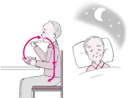 いよいよ具体的な動作にチャレンジしてみます。本人の“できること”を増やしていくためには、“(ベッドから)起きる・立つ・(車いすやいすに)座る”ことをまず目標にしましょう。身体を起こして座る姿勢は腹筋や背筋を鍛え、肺活量を高めます。自分の足で立つことができれば、車いすなどへの移乗も楽になります。また、車いすに移乗できれば活動範囲が広がって、“トイレに行く、食卓で食事をする、外に出る”という具合に、本人の自立を進めるきっかけになります。