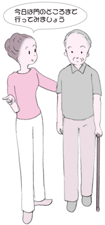 | 介助者側のペースも大切に 本人だけでなく、介助者自身も自分のペースをつかんでおくことが大切です。「一所懸命やらなければ」という思いが強くなると、それがストレスとなって長続きしません。 「今日は疲れている」と感じたら、無理をしないで休む勇気も必要です。その間は、ほかの家族などに任せるようにしましょう。 |