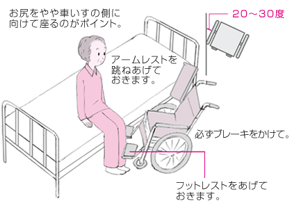 | 車いすを置く位置を考える 車いすは、ベッドやいすに対して20~30度の角度に置きます。片マヒがある場合は、よいほうの手足の側に車いすを置くのが基本です。ただし、よいほうの手で自立バーなどを持って乗り移る場合では、マヒ側に車いすを置くこともあります。 ベッドの高さを調節できる場合は、車いすの座面の高さに合わせます。車いすは必ずブレーキをかけ、フットレストをあげておきます。 アームレストを跳ねあげることができる車いすなら、本人がしっかり立ちあがれない間だけ、跳ねあげておきます。 本人が座る位置は、できる限り車いすに近づけておきます。 |
