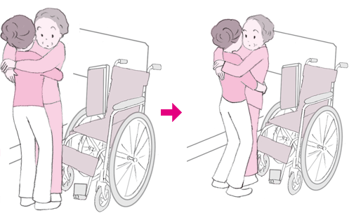 ![]() 座り方が浅くなっている場合は、介助者が後ろにまわり、本人の脇の下から腕を回して、斜め後方に引きあげてお尻を動かします。 |