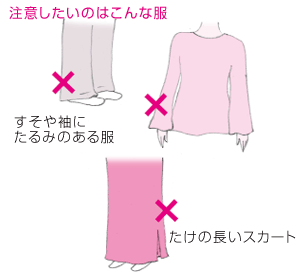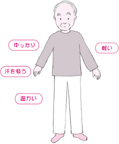 ![]() 上着は身体を締めつけず、軽くて、 吸湿・保温にすぐれた素材のものを選びます。 |