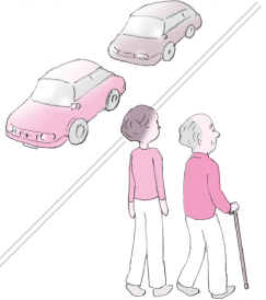 ![]() 自動車のドライバーから認識できるように、 はっきりした色使いのものを身につけます。 服装が地味なら、杖(つえ)などの色を工夫 しましょう。 |