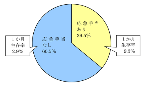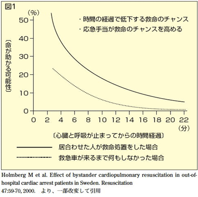 また、下の点線は、バイスタンダーによる救命処置が行われず、現場に到着した救 急隊により救命処置が実施された場合の救命効果を示しています。